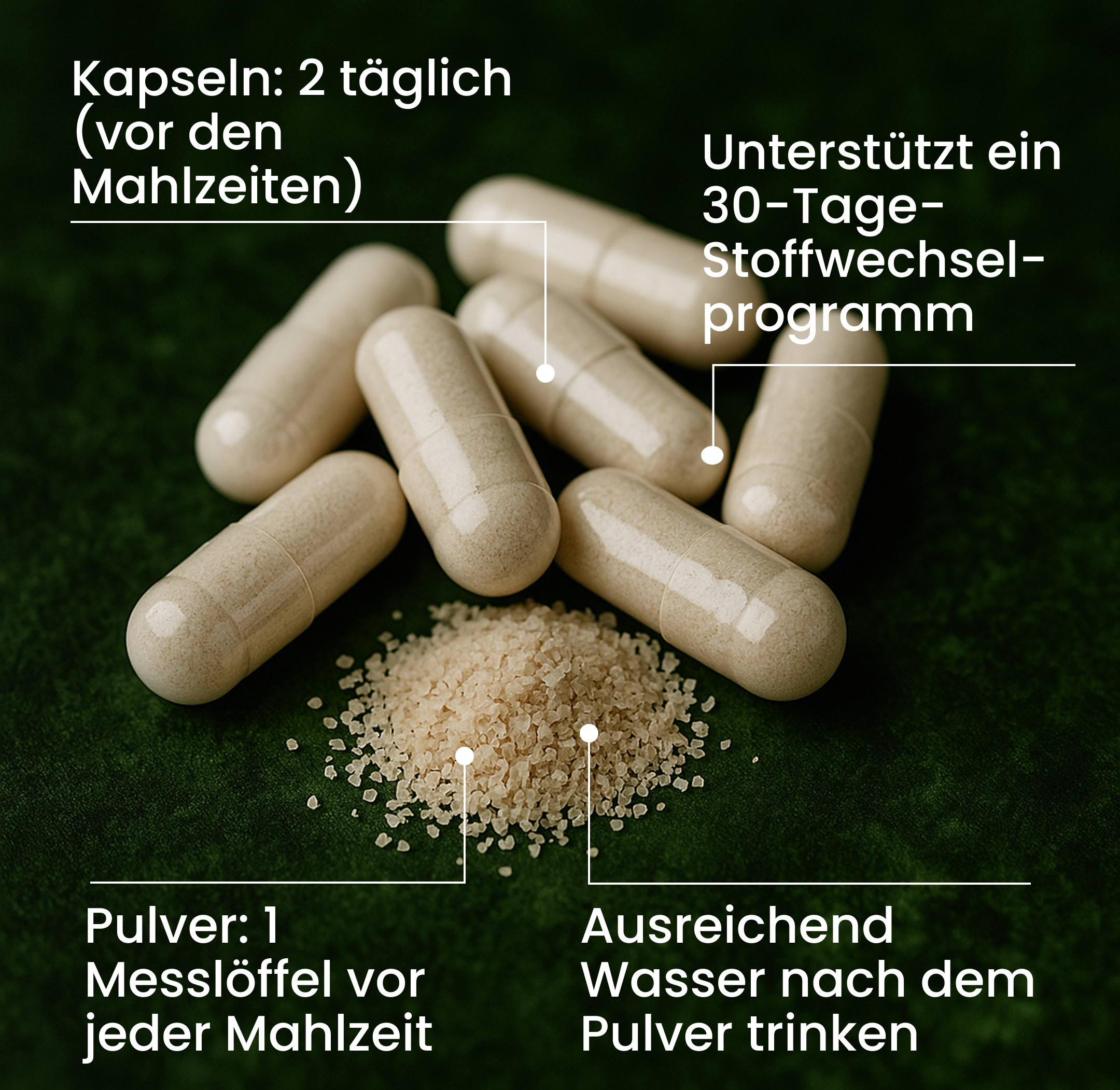 Eine effektive Kombination für Appetitkontrolle, Verdauungsbalance und Stoffwechselunterstützung. Diese Inhaltsstoffe arbeiten harmonisch zusammen, um dein Wohlbefinden zu fördern und deine tägliche Routine sinnvoll zu ergänzen.